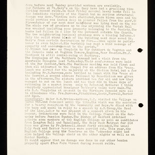 During the Blitz, severe damage was inflicted on the church. Between September 1940 and April 1941 bombs hit the church roof and organ loft, and many of the windows were blown out, including the window above the high altar and the rose window. The Community at 114 Mount Street remained, and the cellars of 114 Mount Street were used as night shelters for the people of Mayfair, but the church was closed and services were continued in the Sodality Hall and Chapel until 1942. After the war, repairs were supervised by the architect Adrian Gilbert Scott (1882-1963) and were not completed until 1951. In 1953 stained glass by the Irish artist Evie Hone (1894-1955) depicting the Instruments of the Passion, was installed in the south front’s rose window to replace the one that had been destroyed.
